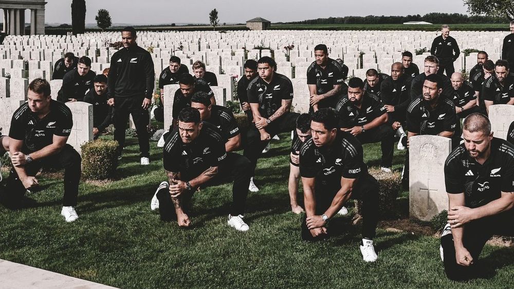 Ahead of the Rugby World Cup, the All Blacks perform the haka at Longueval Cemetery in honour of fallen New Zealand soldiers from the First World War. (One of our leading historians, Pete Smith, had the honour of escorting them around the battlefields of the Somme.) #RWC2023 pic.twitter.com/alUeHVB6aP