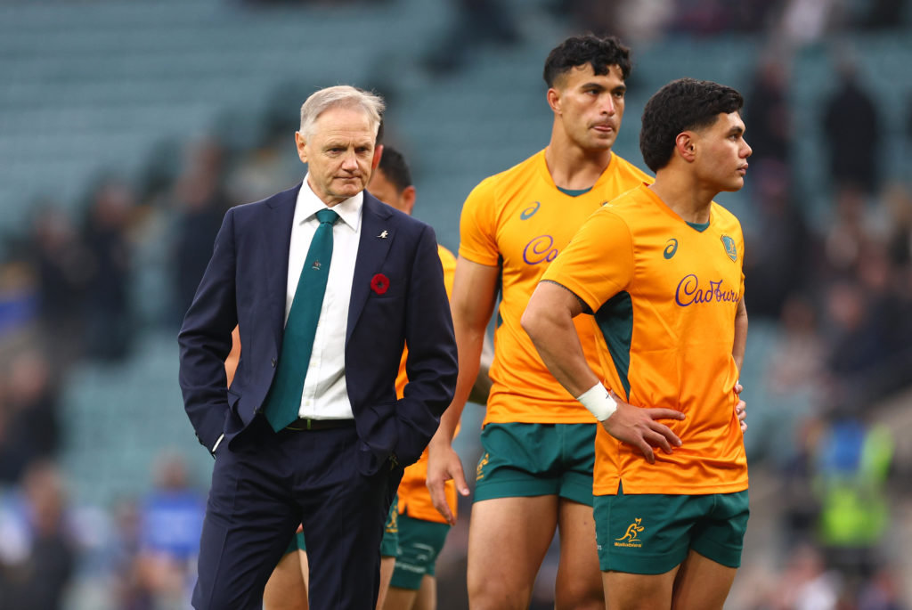 LONDON, ENGLAND - NOVEMBER 09: Joe Schmidt, Head Coach of Australia looks on as the team warms up prior to the Autumn Nations Series 2025 match between England and Australia at Allianz Stadium on November 09, 2024 in London, England. (Photo by Clive Rose/Getty Images)