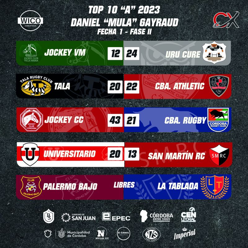 El Torneo Daniel «Mula» Gayraud volvió a tener actividad este sábado. En el inicio de la Fase II ganaron los líderes de la Zona «A» y «B», Urú Curé de Río Cuarto frente a Jockey de Villa María y Jockey de Córdoba hizo lo propio en la zona sur de nuestra capital ante Córdoba Rugby, resultados que lo acercan cada vez más al objetivo de llegar a semifinales.