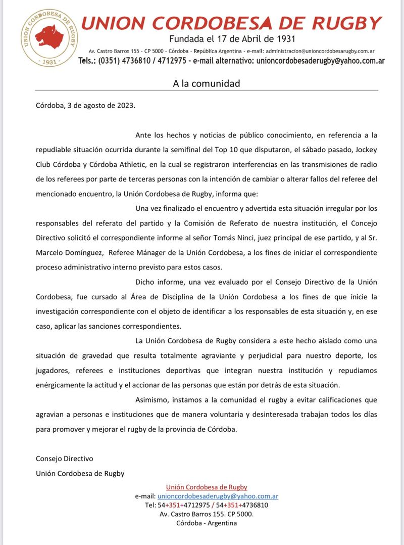 Ante los hechos y noticias de público conocimiento, en referencia a la repudiable situación ocurrida durante la semifinal del Top 10 que disputaron, el sábado pasado, Jockey Club Córdoba y Córdoba Athletic, en la cual se registraron interferencias en las transmisiones de radio de los referees por parte de terceras personas con la intención de cambiar o alterar fallos del referee del mencionado encuentro, la Unión Cordobesa de Rugby, informa que: